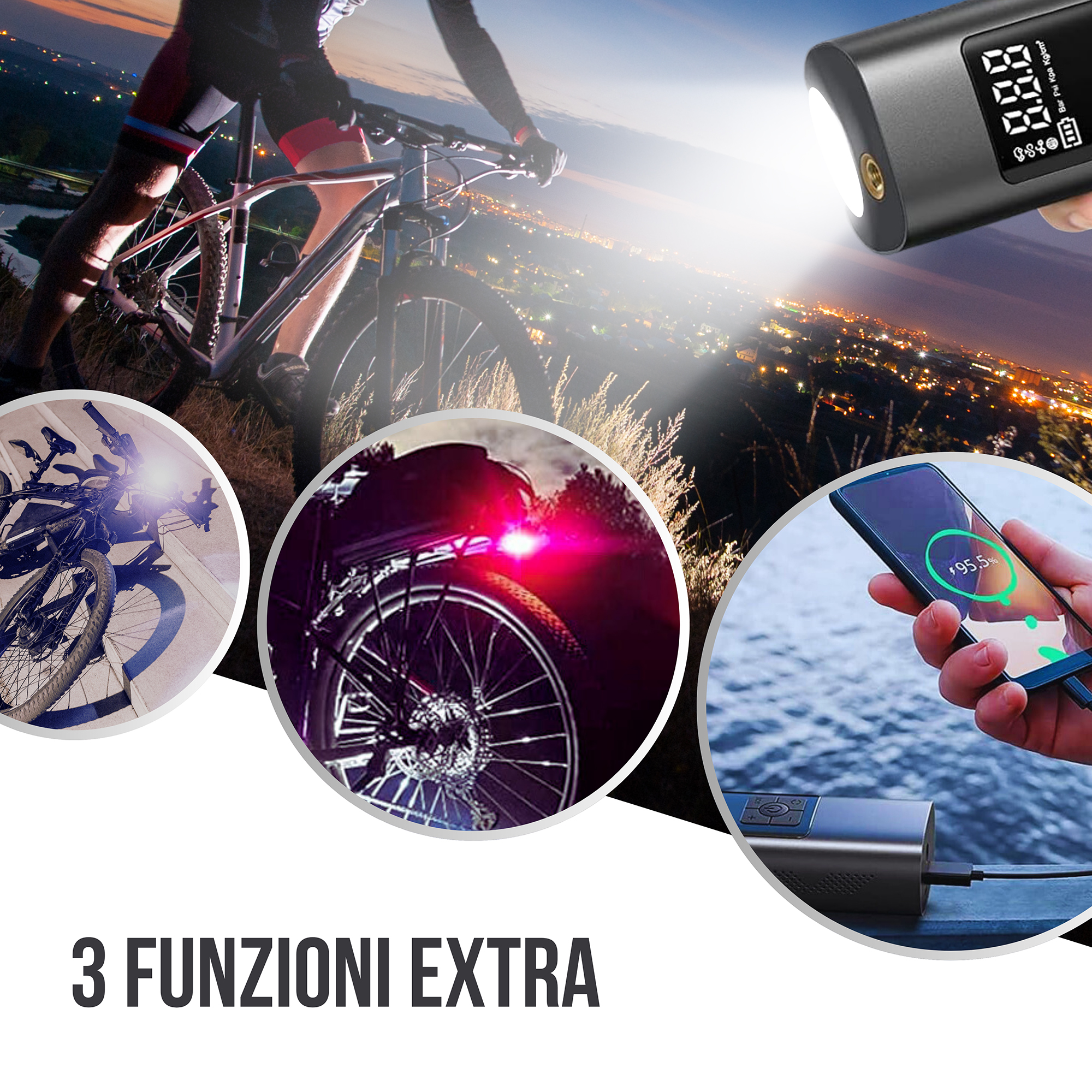 Durchflussrate 20 Liter/Minute, max. Druck 10,8 bar, Akkukapazität 6000 mAh 12 V DC – mit LED-Taschenlampe (weißes Licht mit hoher Helligkeit und rotes Blinklicht) und Powerbank-Funktion, 4 Adapter im Lieferumfang enthalten (zum Aufpumpen von Autoreifen, Motorrädern, Bällen, Matten)