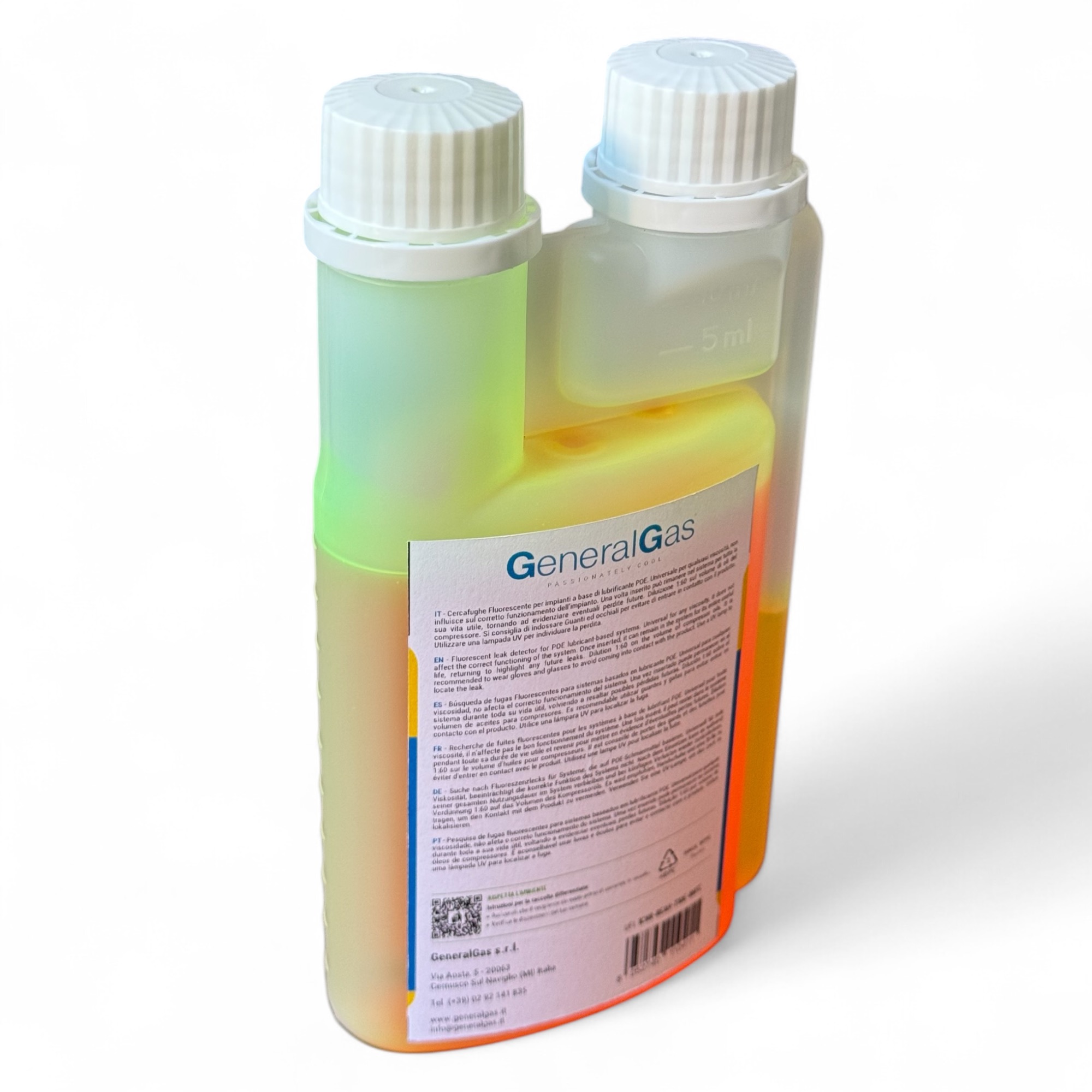 Es reagiert unter UV-Licht mit einem intensiven fluoreszierenden Gelb. Das empfohlene Verdünnungsverhältnis beträgt 1 ml pro 60 ml Kompressorschmierstoff. Sie können es manuell, in den Auffangbehälter oder über einen Bypass einführen. Sie können es sowohl präventiv als auch zur Lecksuche bei Verdacht auf eine Undichtigkeit einsetzen. Das Produkt beeinträchtigt die Systemfunktionalität nicht und verbleibt nach Gebrauch im Kreislauf für eventuelle zukünftige Suchen. Ein moderater Produktüberschuss hat keine negativen Auswirkungen auf die Funktionalität.