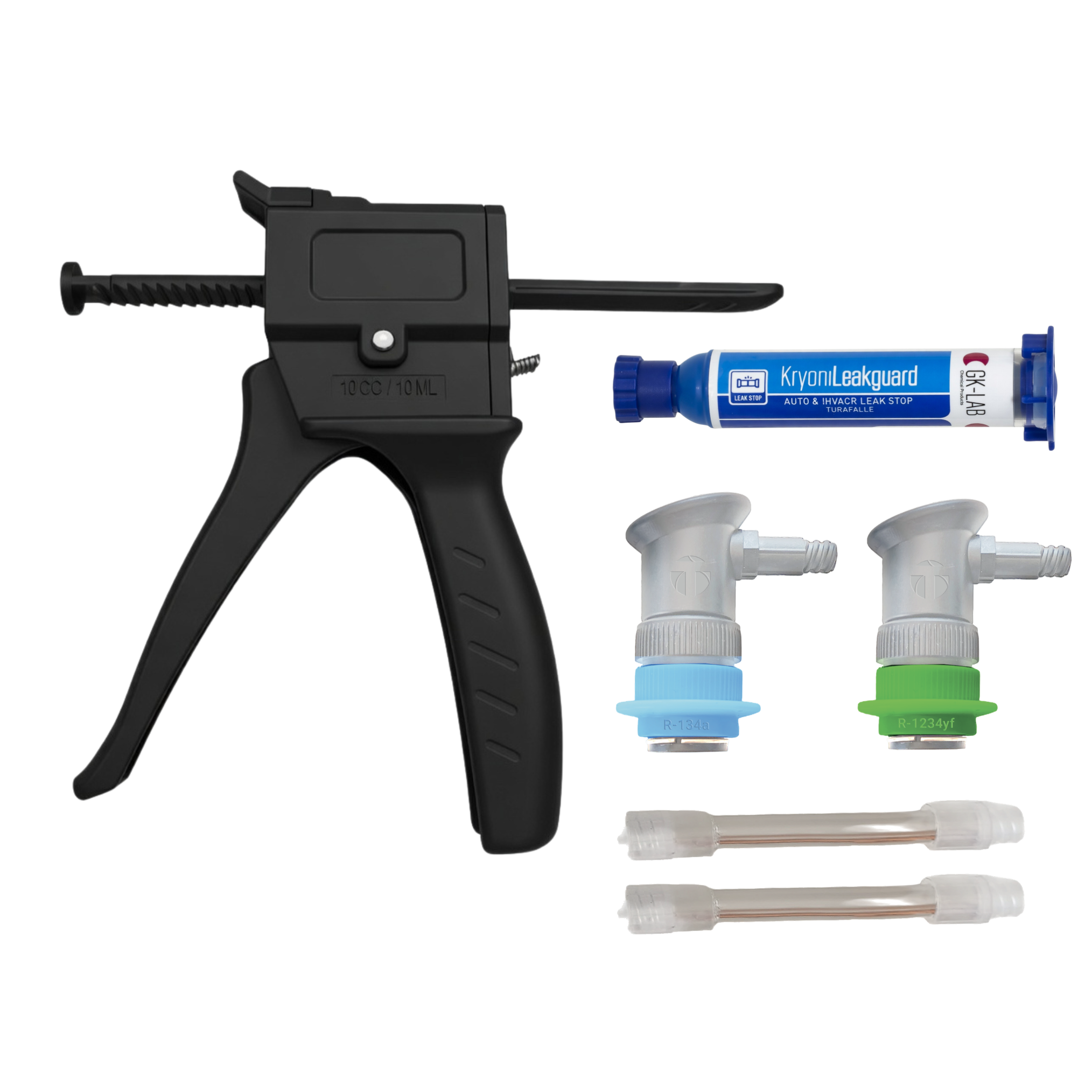 Enthält: 1 kleine GK-Gun SMART Pistole zur Verwendung mit 8-ml-Kartuschen, 2 selbstabdichtende Flexible Anschlüsse für R134a und R1234yf, 1 x 8-ml KryonLeakGuard Dichtmittelkartusche, alles in einem Kunststoffkoffer.