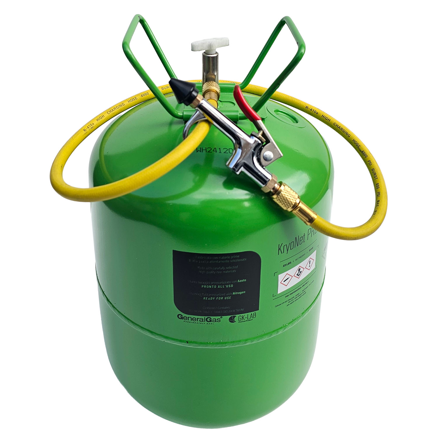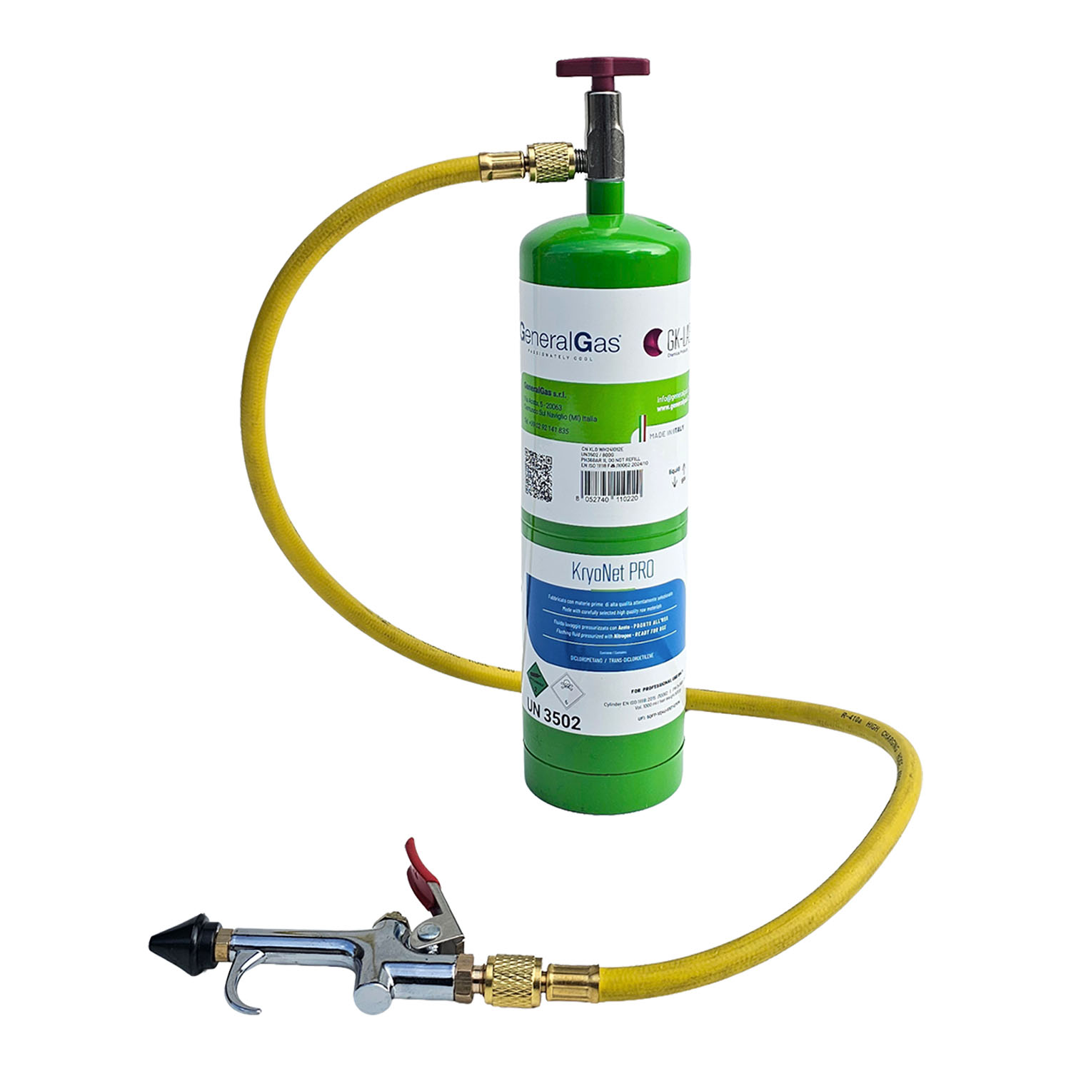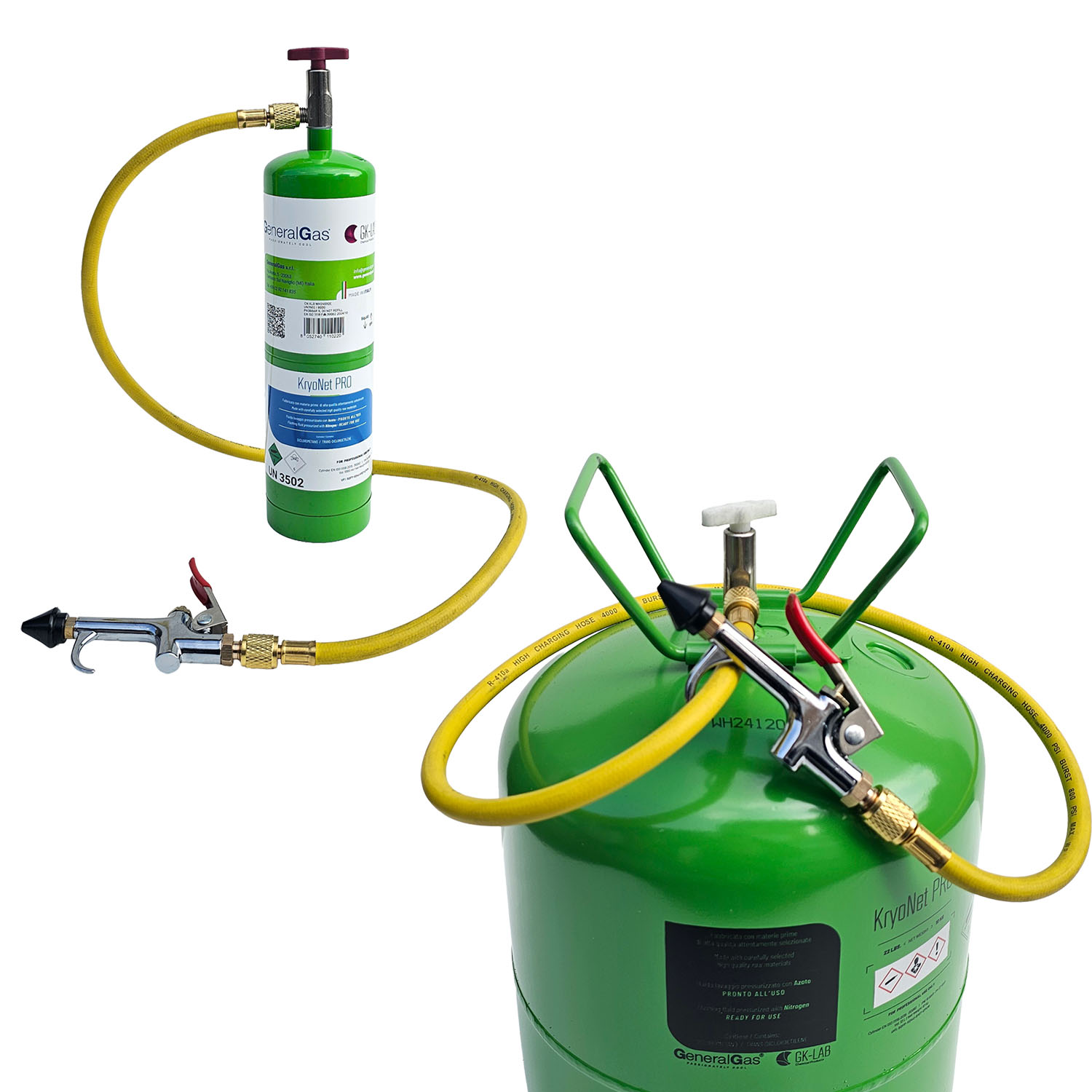 Pistole und Schlauch mit beidseitigem 1/4-Zoll-Anschluss für den Einsatz mit KryoNet PRO-Lösungsmittel in 13-Liter-Einwegdruckbehältern (10 kg Lösungsmittel) und 1-Liter-Einwegdruckbehältern (800 g Lösungsmittel)