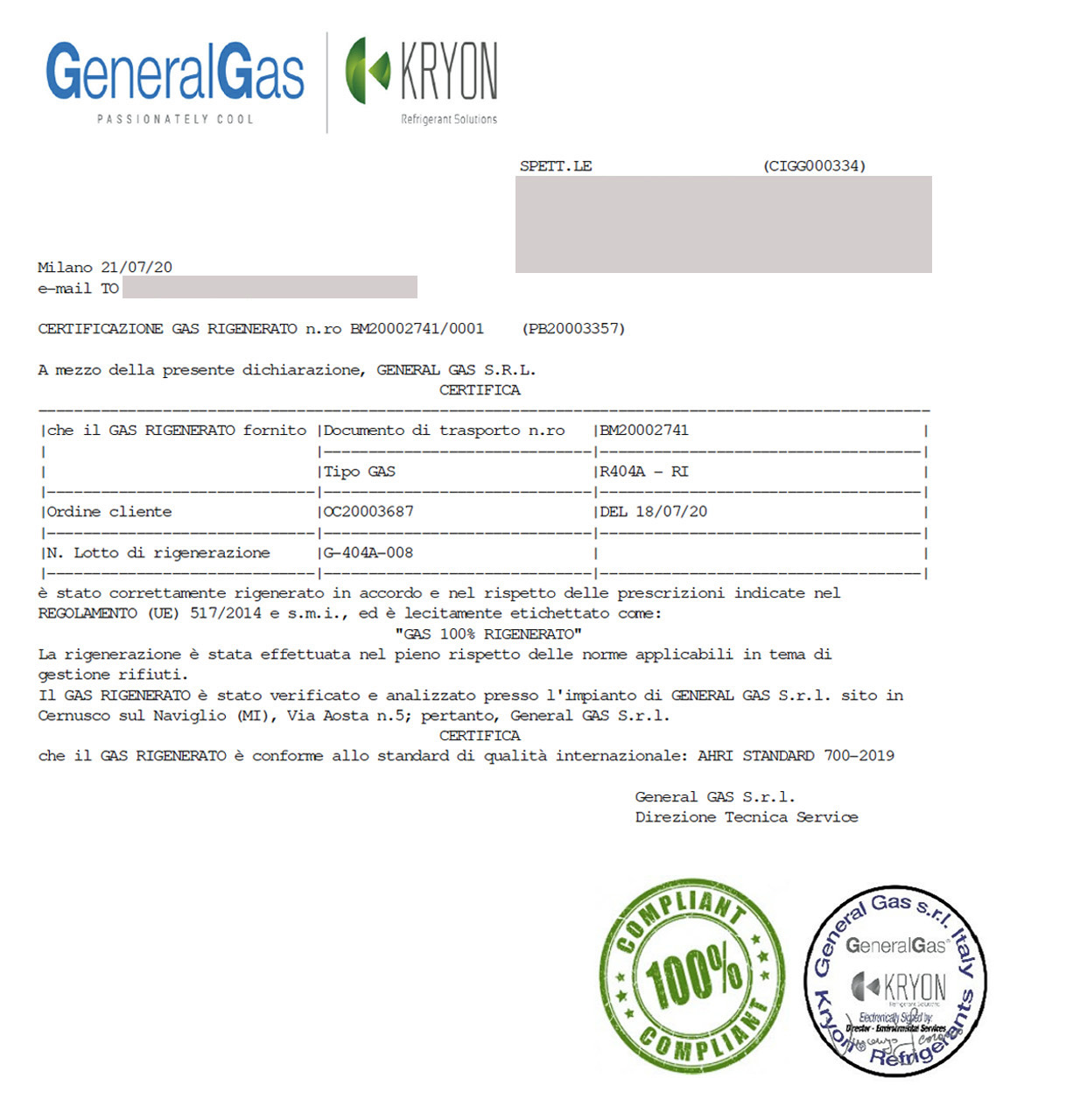 Das von GeneralGas gelieferte regenerierte Gas ist gemäß RE 517/2014 mit dem Hinweis versehen, dass die Substanz korrekt regeneriert wurde, mit der Angabe der Chargennummer sowie dem Namen und der Adresse der Regenerationsanlage.