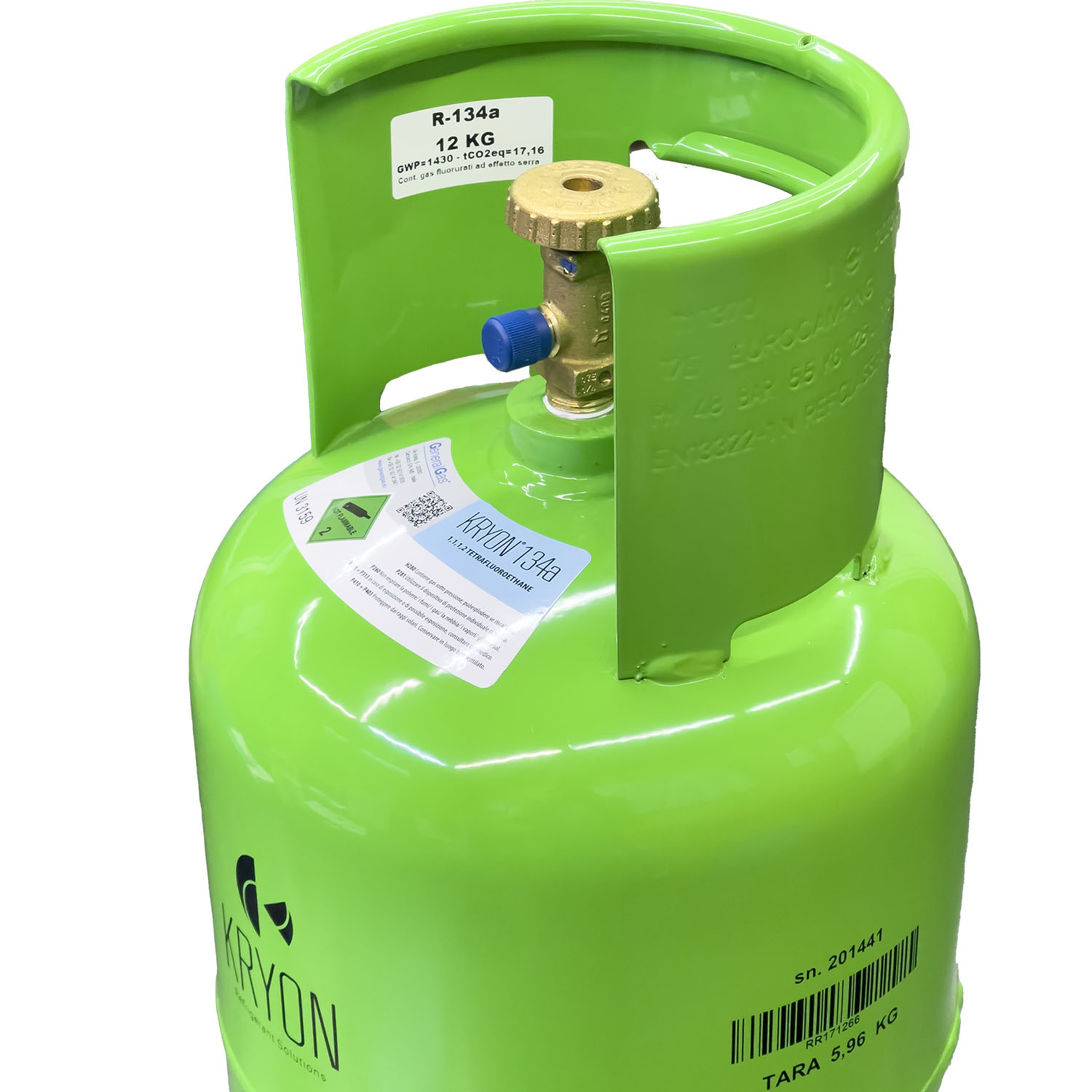 KryoBox-Flaschen sind nachfüllbar; sie können regeneriert und nachgefüllt werden, wobei ein gelber "F-Gas Friend"-Aufkleber auf der Flasche angebracht wird.