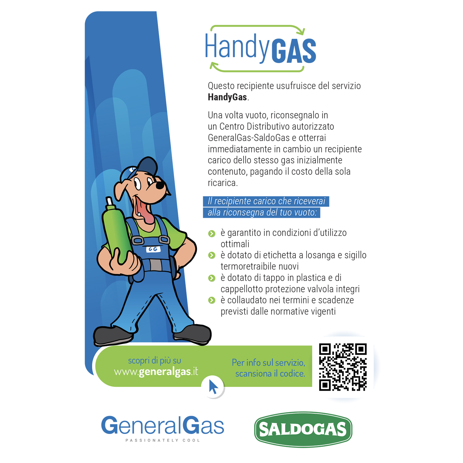 Der Kunde, der zuvor bei GeneralGas/SaldoGas die 5 und/oder 14 Liter-Flasche (Azohydro, Stickstoff, Sauerstoff, Acetylen) inklusive der ersten Gasfüllung gekauft hat, hat automatisch den HandyGas-Service aktiviert, der ihn zum nachträglichen "leer zu voll"-Austausch seines Behälters berechtigt.