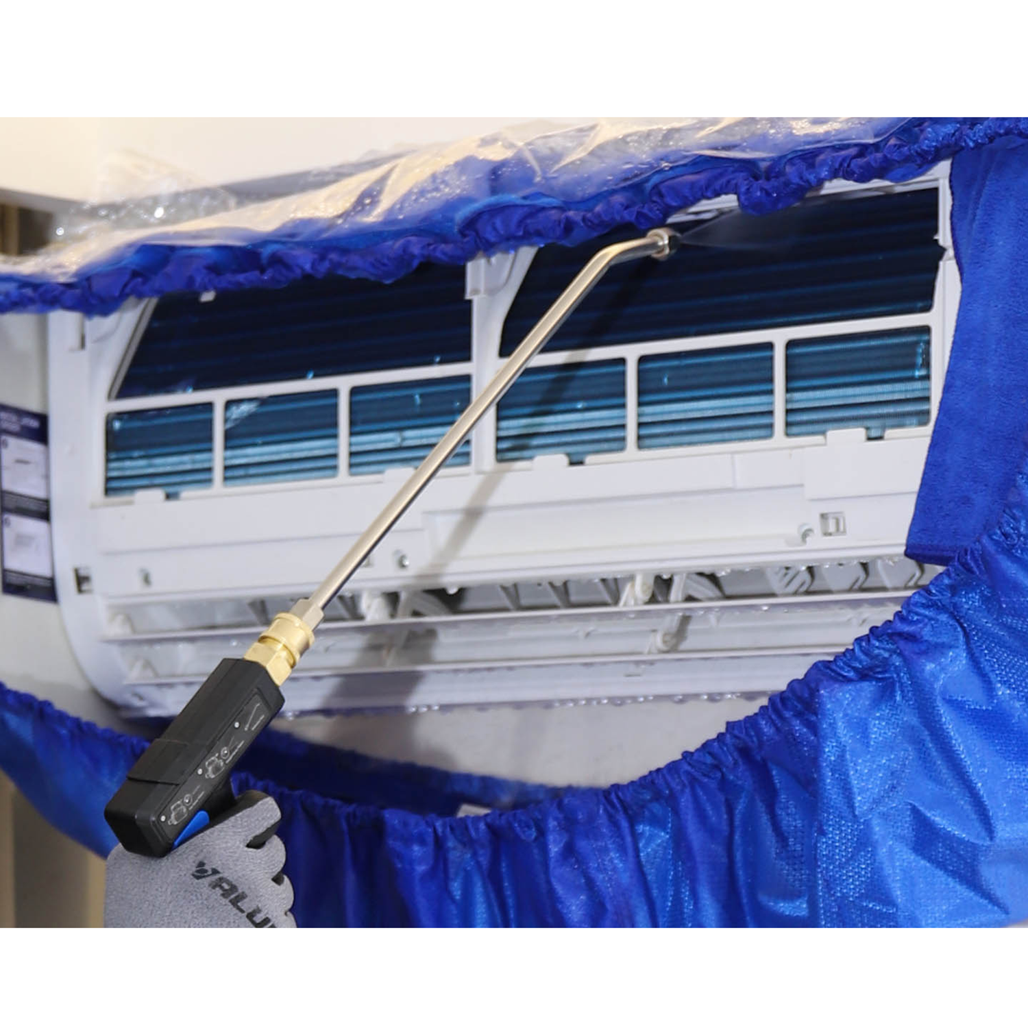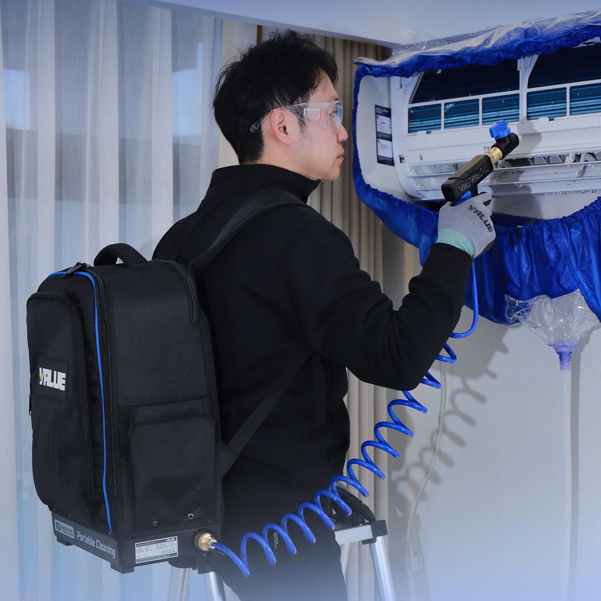 Reinigung von Innen- und Außeneinheiten von Klimaanlagen, Wärmepumpen und Kälteanlagen. Geeignet für planmäßige und außerplanmäßige Wartungsarbeiten in Umgebungen, in denen die Verfügbarkeit von Leitungswasser oder Steckdosen nicht gewährleistet ist.