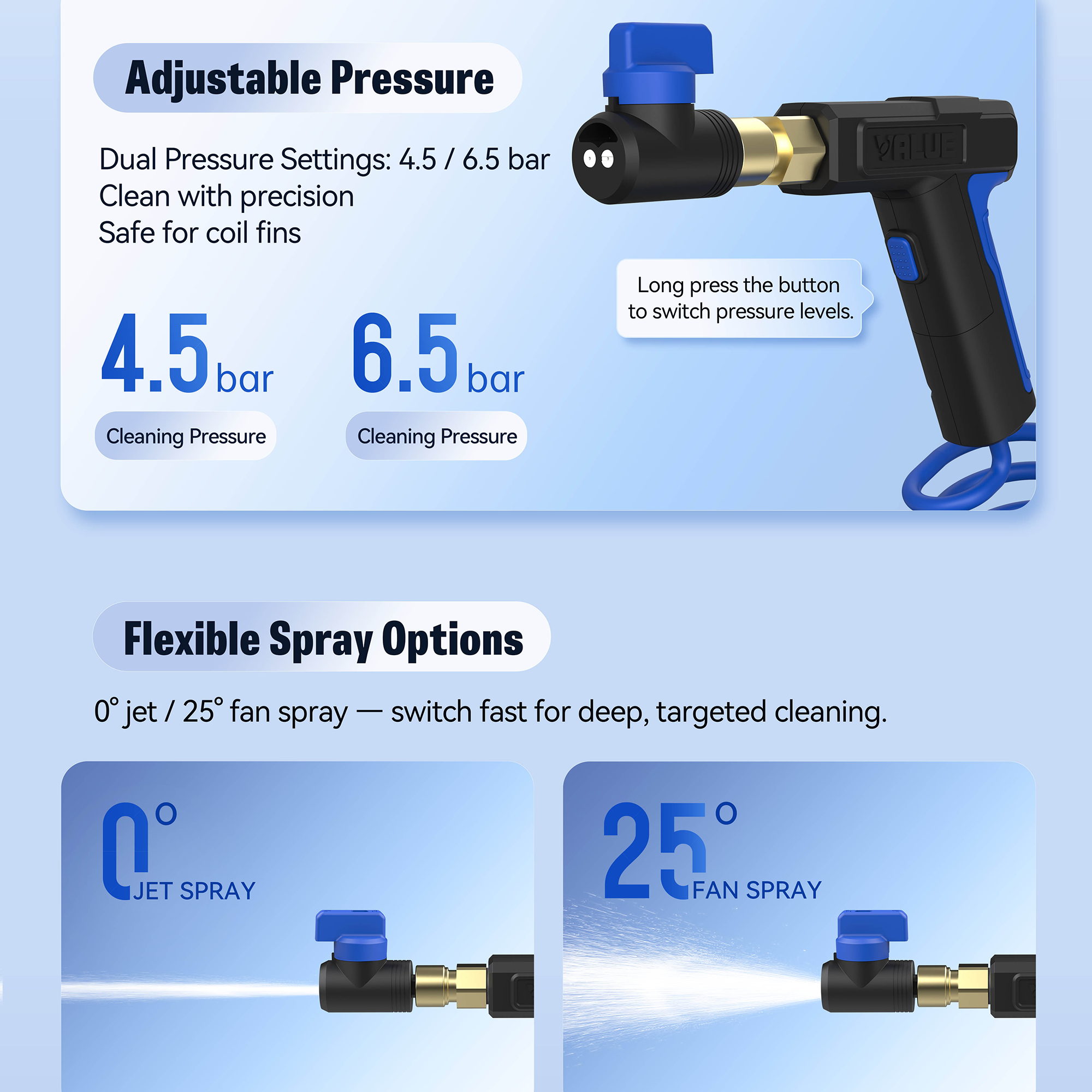 Die Rucksackstruktur hält beide Hände des Technikers bei Bewegungen frei. Die zwei wählbaren Druckstufen (4,5 / 6,5 bar) ermöglichen die Anpassung der Wasserabgabe an die Empfindlichkeit des zu behandelnden Bauteils: von den empfindlichsten Lamellenregistern bis hin zu Oberflächen, die eine intensivere Reinigung erfordern. Der 25°-Fächerstrahl sorgt für eine gleichmäßige Abdeckung auch in schwer zugänglichen Bereichen; der Geradstrahlmodus (0°) steht für gezielte Nahbereichsarbeiten zur Verfügung.